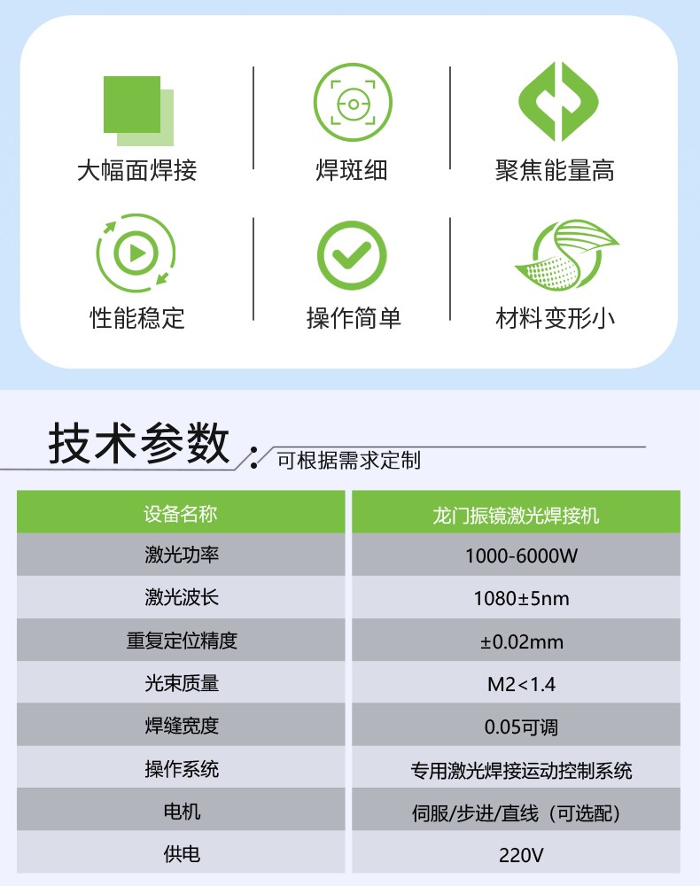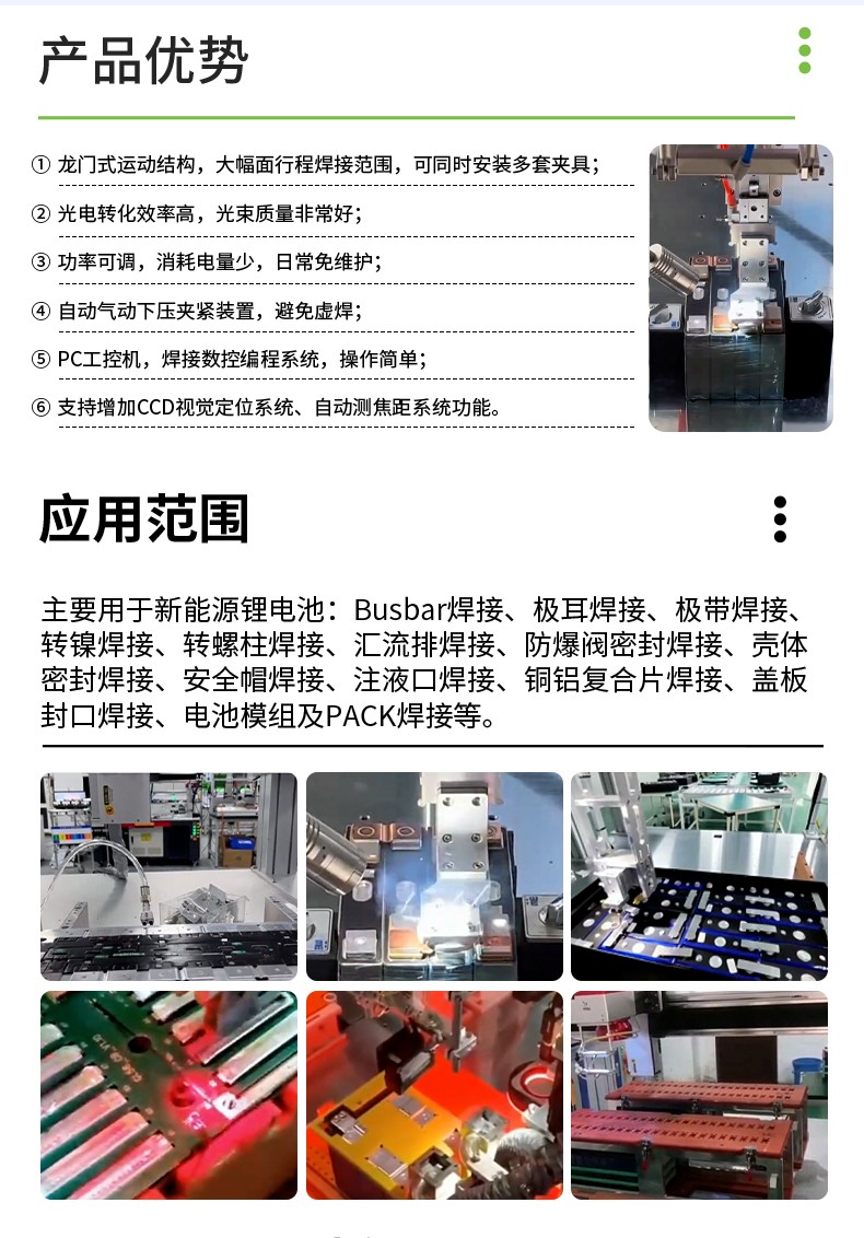 采用光纖連續(xù)激光器、龍門運動結構、高功率振鏡焊接頭、水冷系統(tǒng)、PC機控制系統(tǒng)等重要部件集成,具有高功率、精細光束質(zhì)量、免維護、高電光轉換效率等特性,可進行點、直線、圓等任意平面幾何圖形軌跡焊接,是一款高效、安全、穩(wěn)定的高功率光纖激光焊接機,在新能源電池焊接方面表現(xiàn)優(yōu)異,可焊接各種規(guī)格型號的鋰電池組。