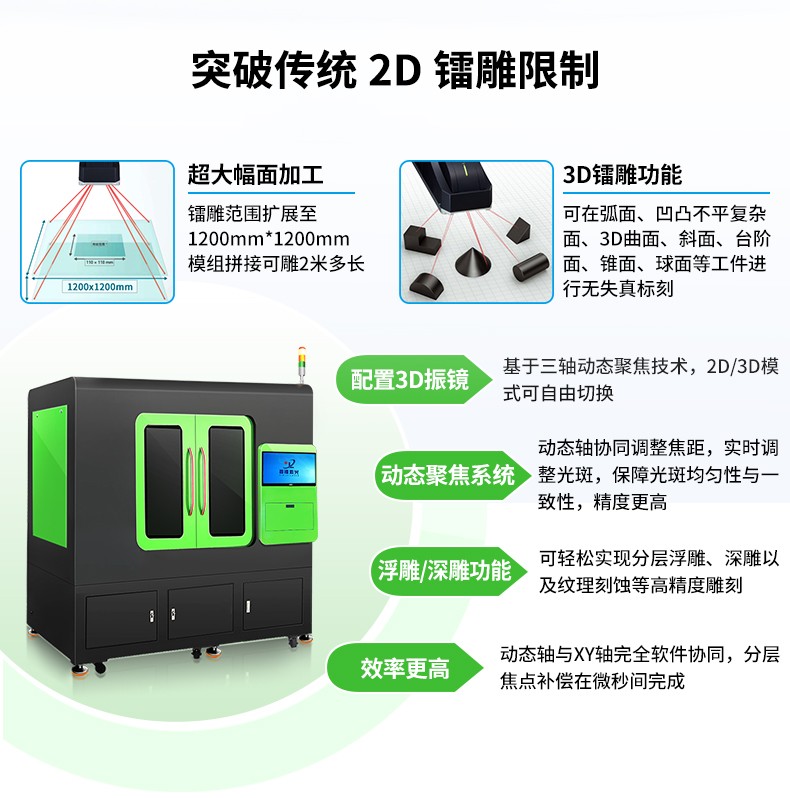 三維動態(tài)聚焦系統(tǒng):通過動態(tài)調整激光焦距,確保在復雜曲面上實現(xiàn)均勻雕刻。