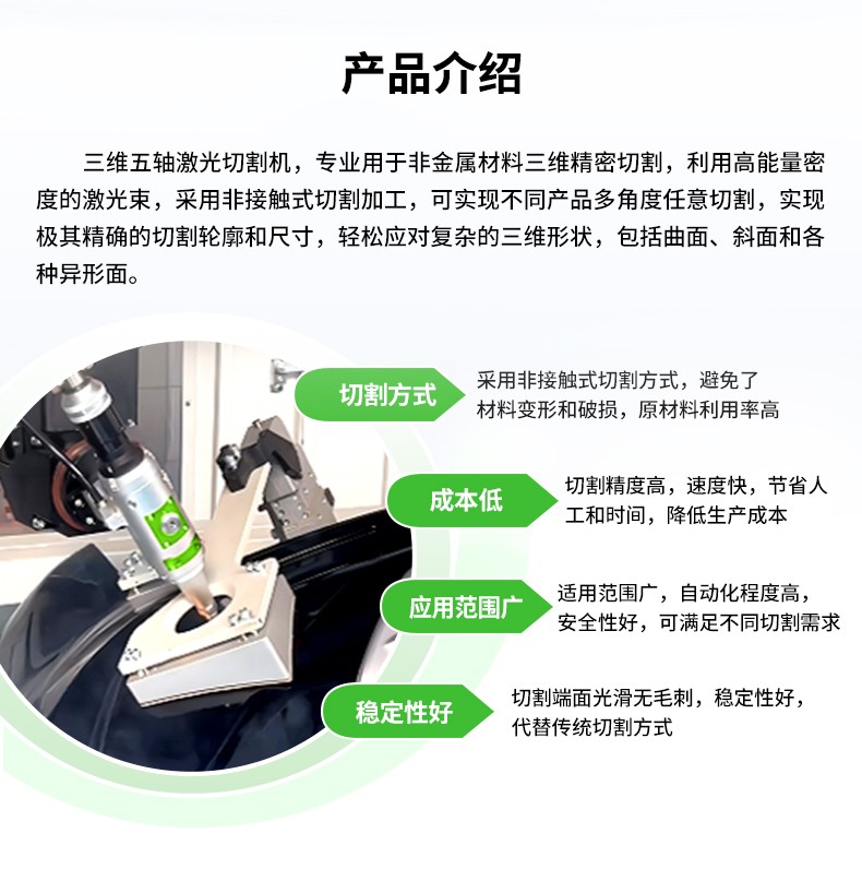 專業(yè)用于非金屬材料三維立體精密切割,可實(shí)現(xiàn)不同產(chǎn)品多角度任意切割,實(shí)現(xiàn)極其精確的切割輪廓和尺寸,
